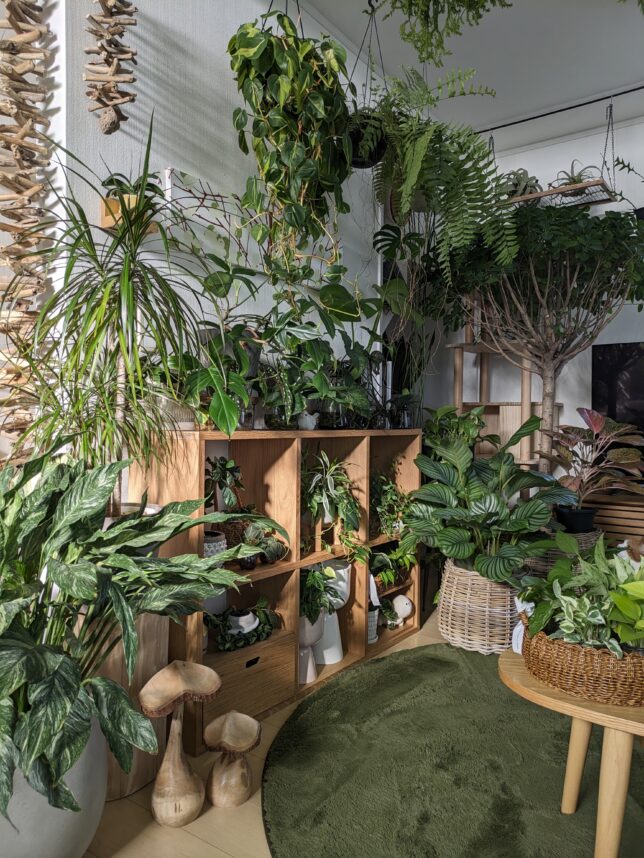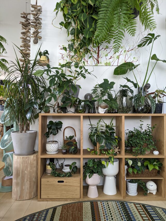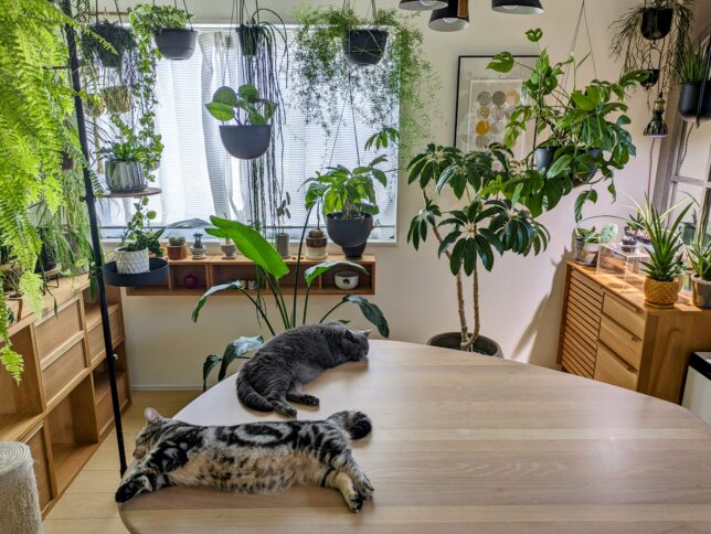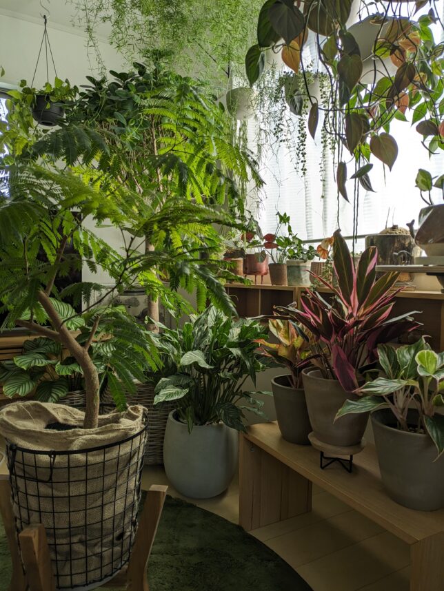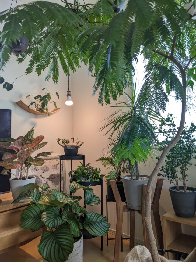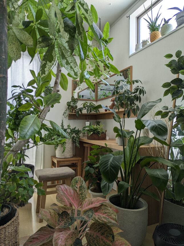 レイアウトは植物それぞれに合わせた日光量が当たる配置にしたり、葉っぱ同士がぶつからないように高低差をつけて置いたり、エアコンの風が当たらないように考えたりしています。